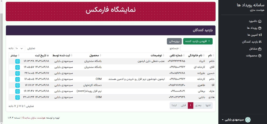 در بخش بازدید کنندگان کلیه اطلاعات ثبت شده توسط کاربران نمایش داده می شود و مدیر می تواند وضعیت رکورد های ثبت شده را از لحاظ رویداد، کمپین، نام کاربر و وضعیت پیگیری بررسی کند.
