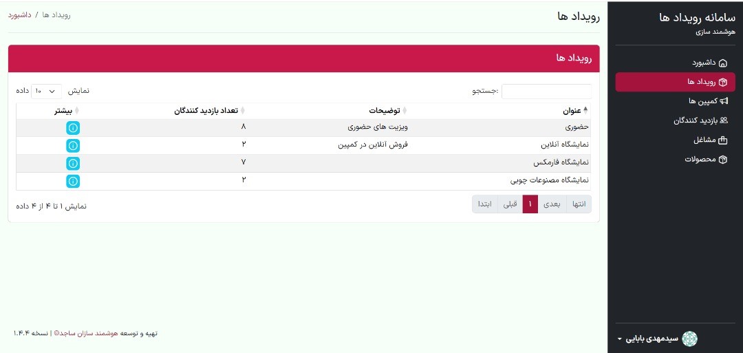 با اننخاب گزینه آبی در لیست رویداد ها برای هر رویداد، اطلاعات بازدیدکنندگان قابل مشاهده است.